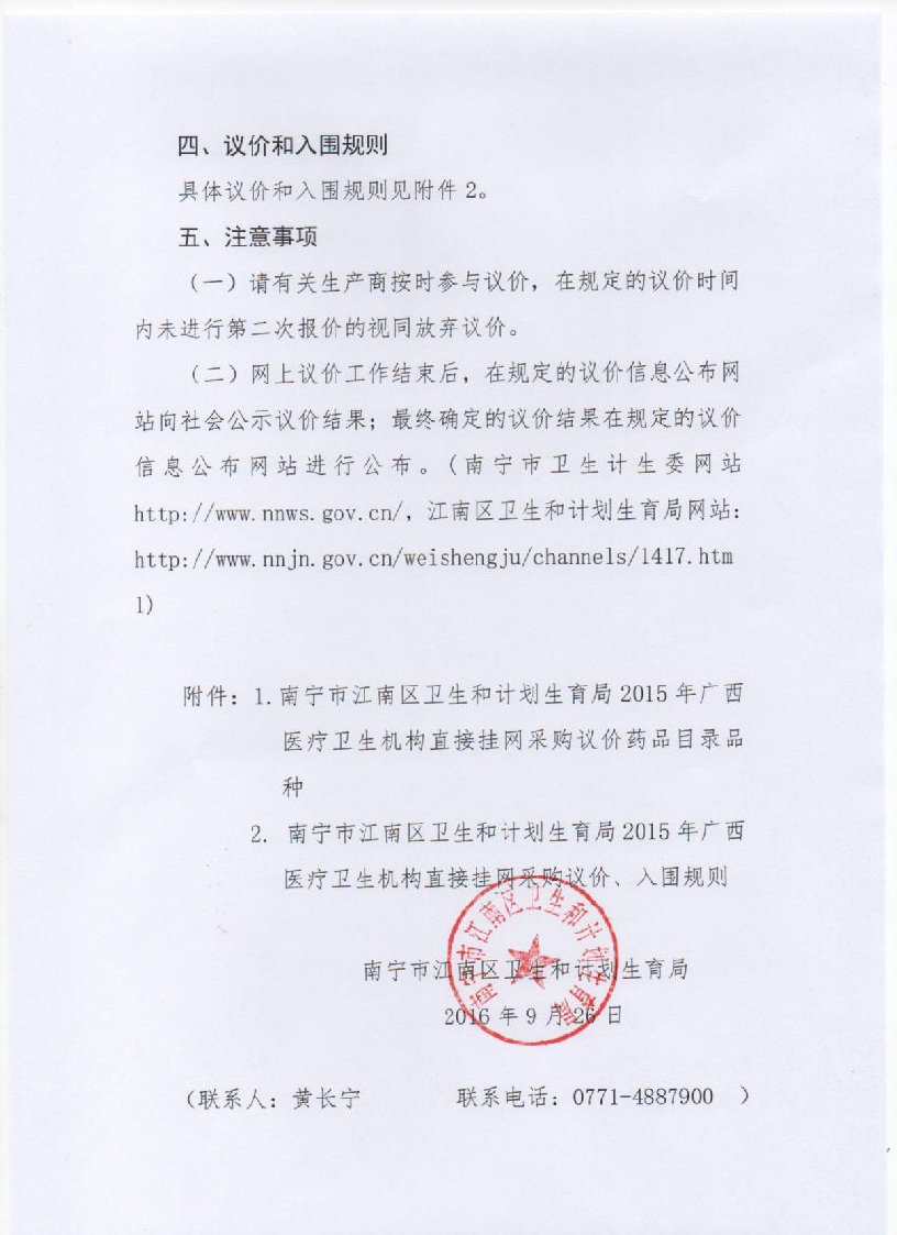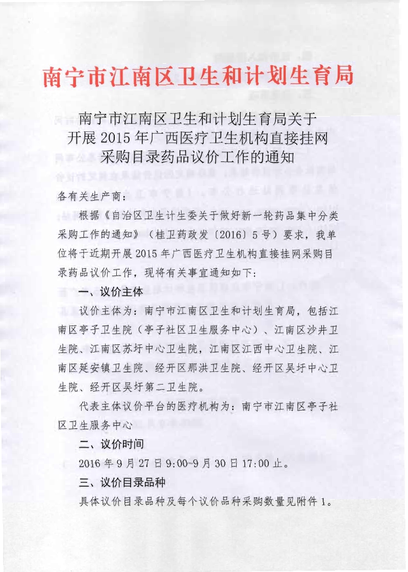 广西壮族自治区南宁市江南区卫生和计划生育局关于开展2015年广西医疗卫生机构直接挂网采购目录药品议价工作的通知