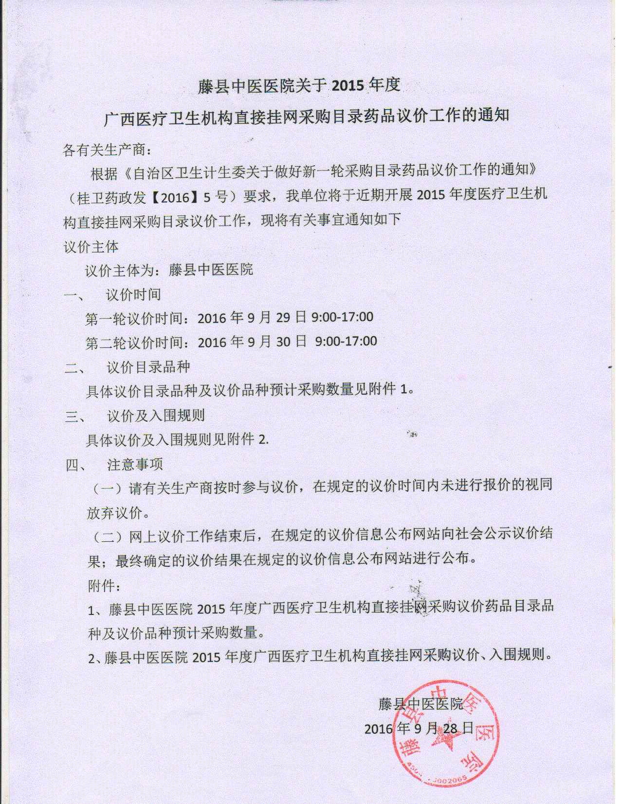 广西壮族自治区梧州市藤县中医医院关于2015年度广西医疗卫生机构直接挂网采购目录药品议价工作的通知