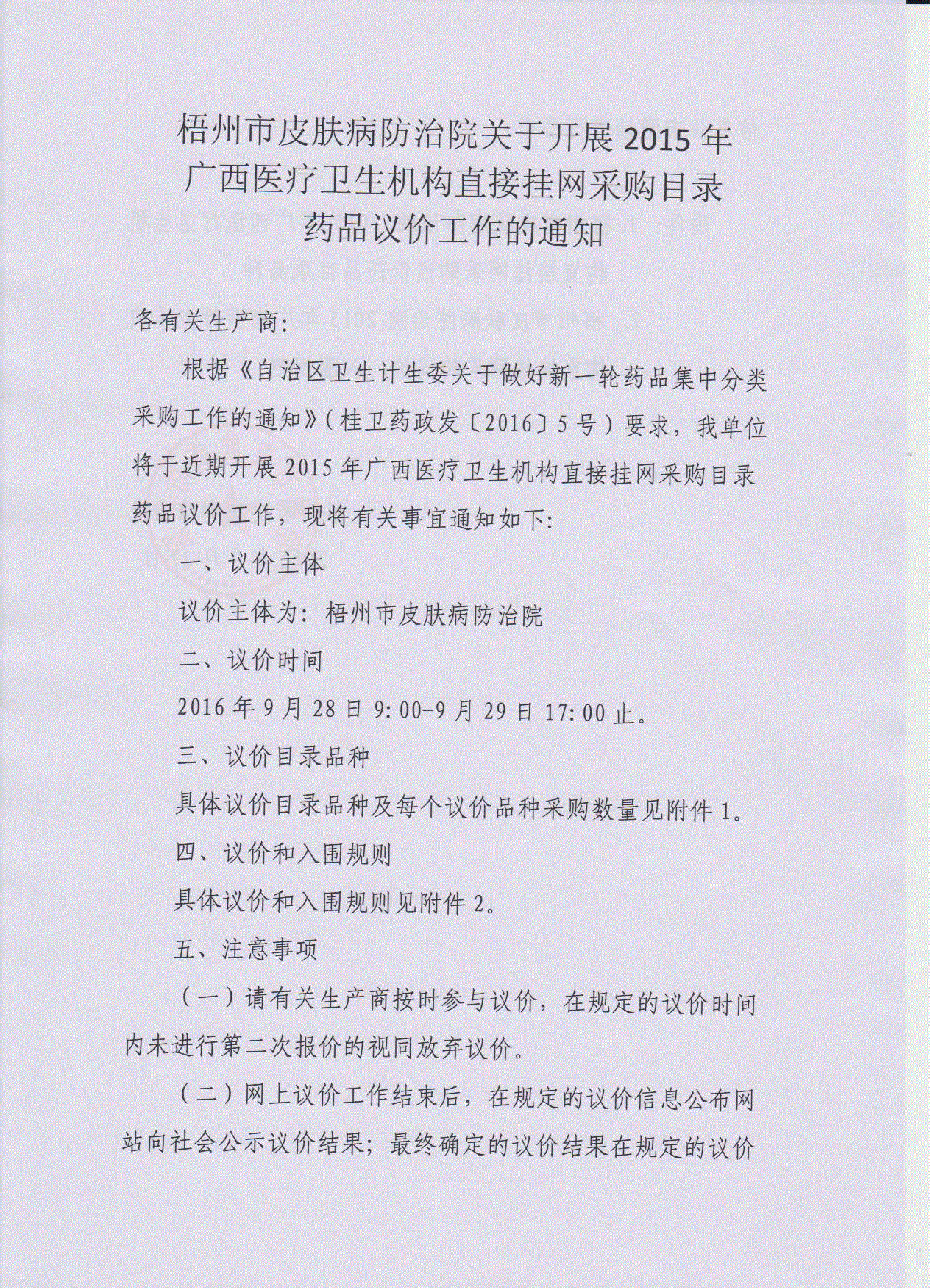 广西壮族自治区梧州市皮肤病防治院关于开展2015年广西医疗卫生机构直接挂网采购目录药品议价工作的通知