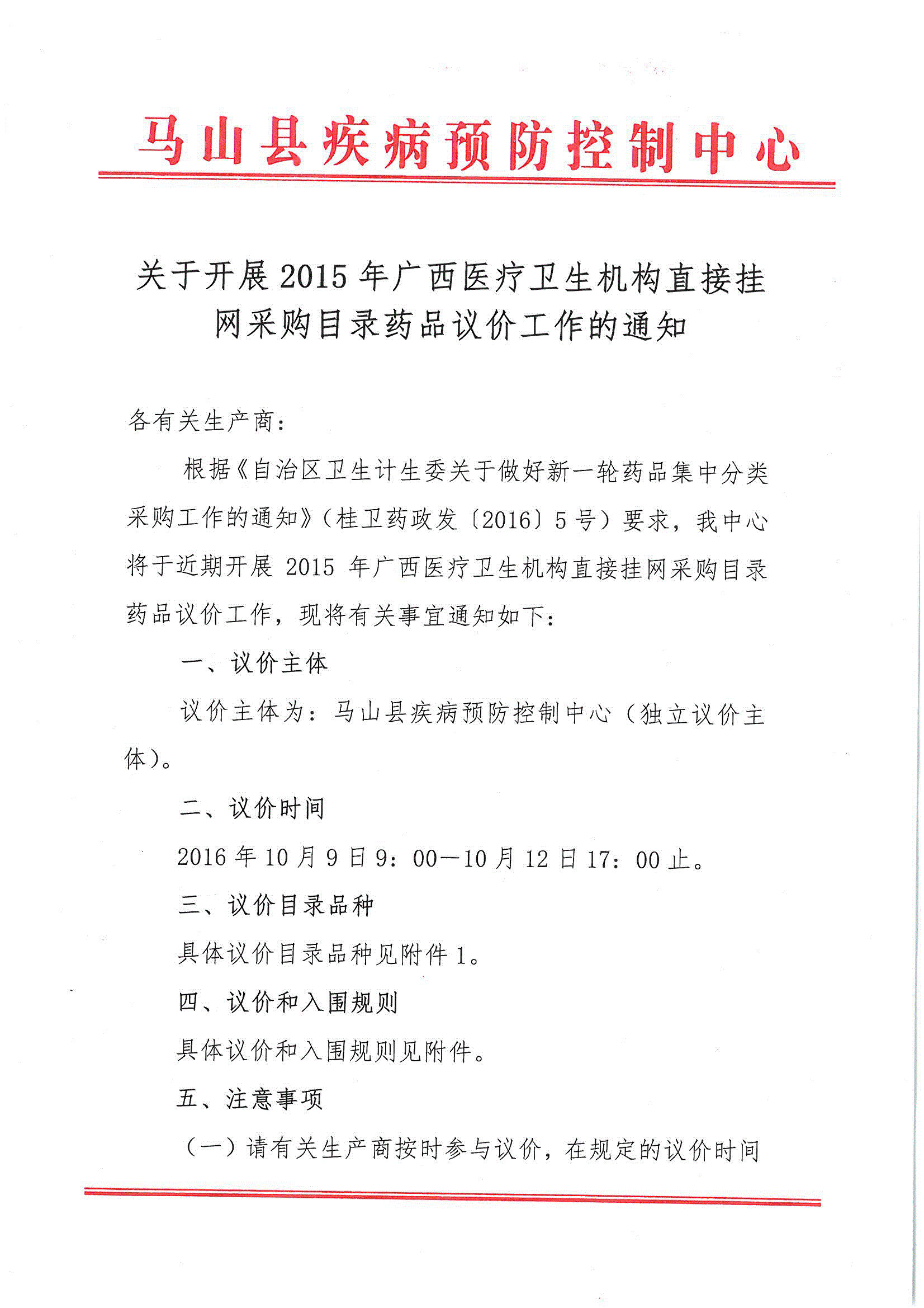 广西壮族自治区南宁市马山县疾病预防控制中心关于开展2015年广西医疗卫生机构直接挂网采购目录药品议价工作的通知