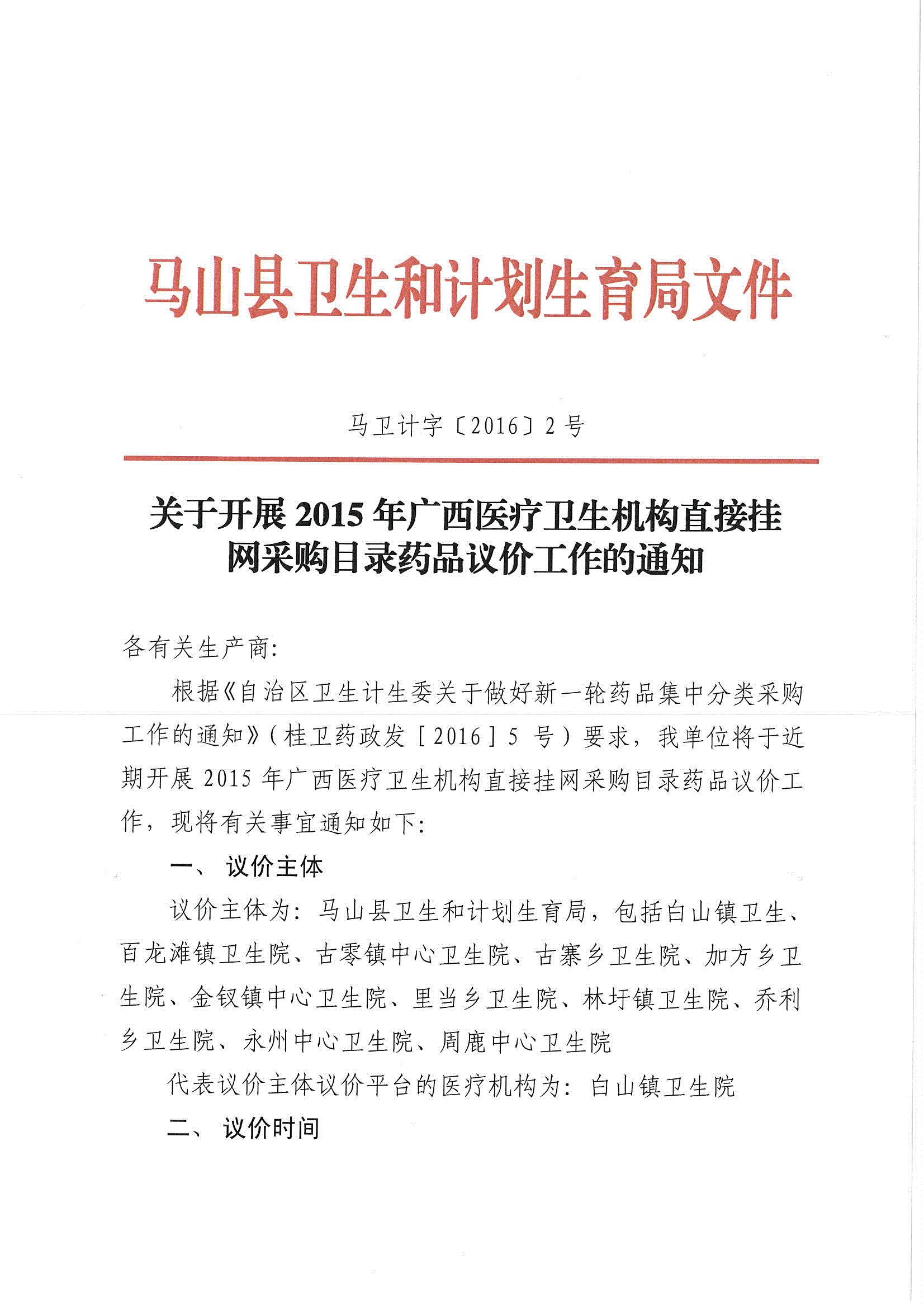> 广西壮族自治区南宁市马山县卫生和计划生育局关于开展2015年广西医疗卫生机构直接挂网采购目录药品议价工作的通知