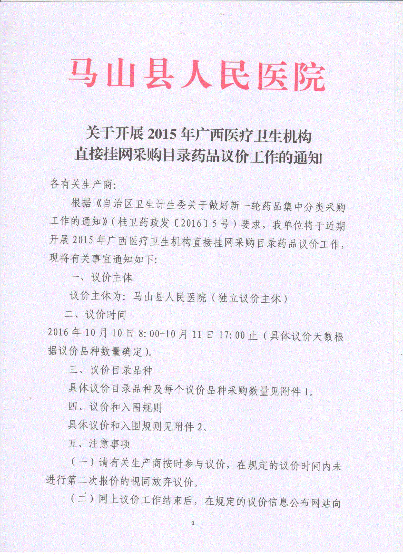 > 广西壮族自治区南宁市马山县人民医院关于开展2015年广西医疗卫生机构直接挂网采购目录药品议价工作的通知