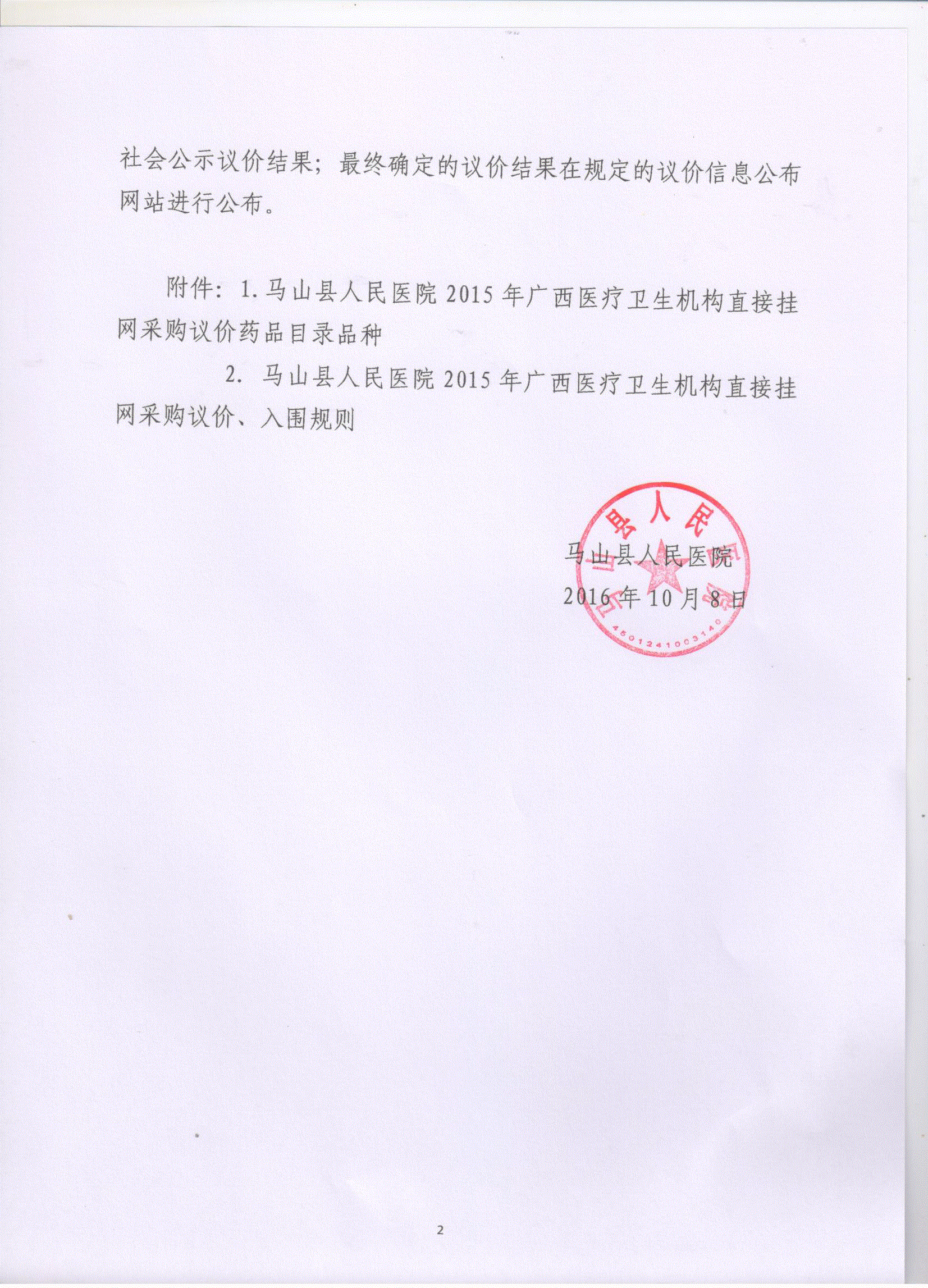 广西壮族自治区南宁市马山县人民医院关于开展2015年广西医疗卫生机构直接挂网采购目录药品议价工作的通知