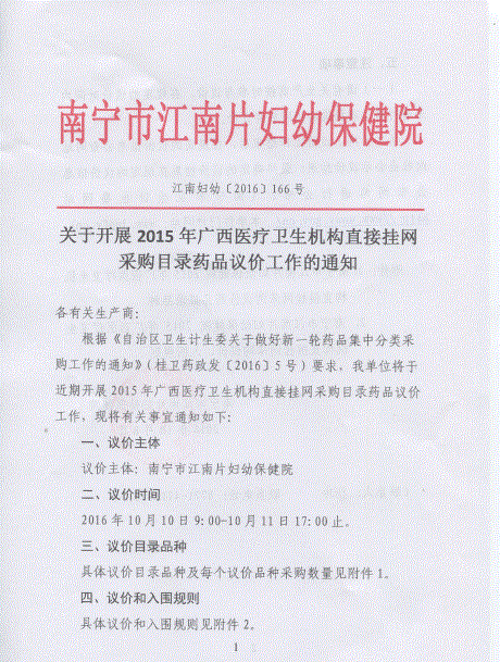 > 广西壮族自治区南宁市江南片妇幼保健院关于开展2015年医疗卫生机构直接挂网采购目录药品议价工作的通知