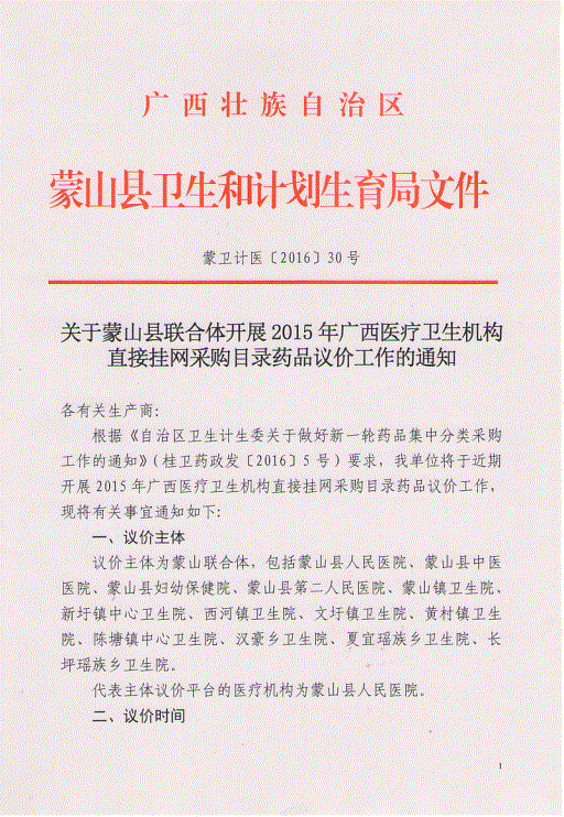 > 广西壮族自治区梧州市关于蒙山县联合体开展2015年广西医疗卫生机构直接挂网采购目录药品议价工作的通知