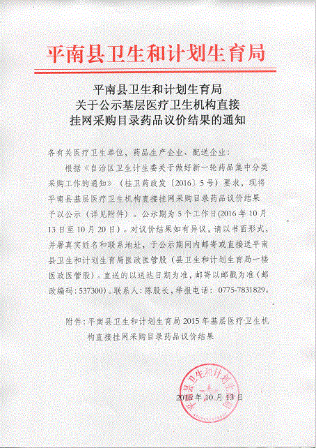 > 2016年广西壮族自治区贵港市平南县关于公示基层医疗卫生机构直接挂网采购目录药品议价结果的通知