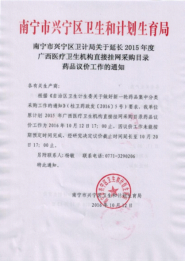 > 广西壮族自治区南宁市兴宁区卫生和计划生育局关于延长2015年广西医疗卫生机构直接挂网采购目录药品议价工作的通知