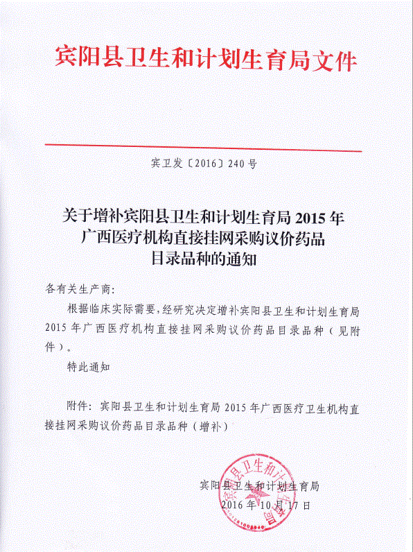 广西壮族自治区关于增补宾阳县卫生和计划生育局2015年广西医疗机构直接挂网采购议价药品目录品种的通知