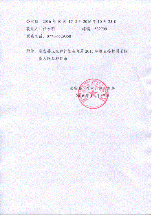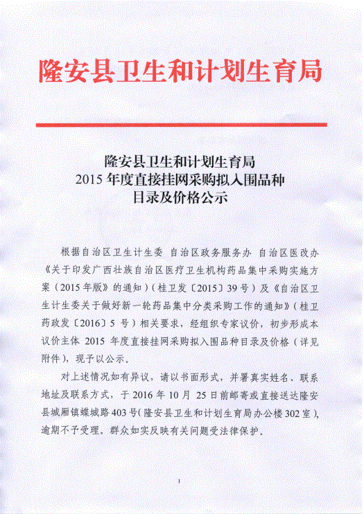 > 广西壮族自治区南宁市隆安县卫计局关于2015年度直接挂网采购拟入围品种目录及价格公示