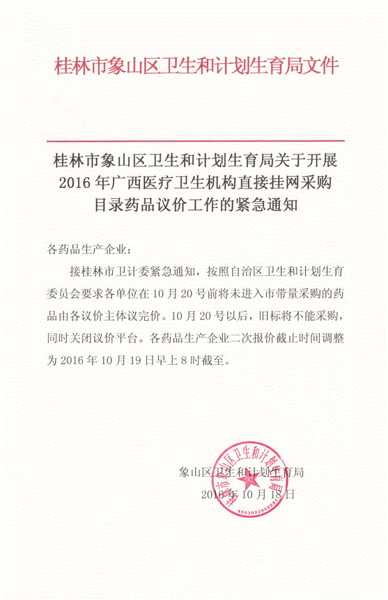 > 广西壮族自治区桂林市象山区卫生和计划生育局关于开展2016年广西医疗卫生机构直接挂网采购目录药品议价工作的紧急通知