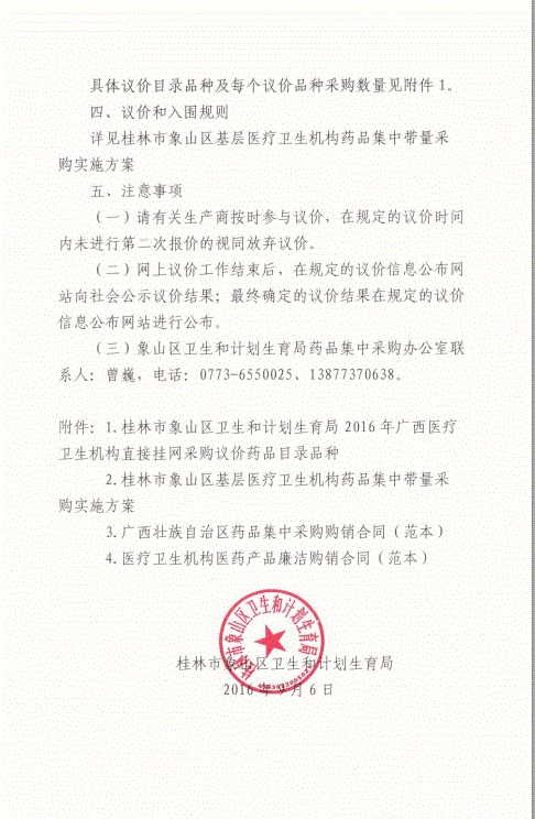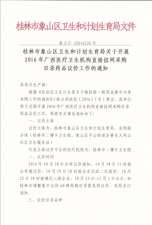 广西壮族自治区桂林市象山区卫生和计划生育局关于开展2016年广西医疗卫生机构直接挂网采购目录药品议价工作的通知