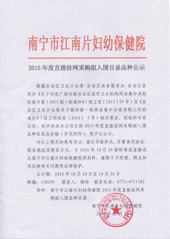 广西壮族自治区南宁市江南片妇幼保健院2015年度直接挂网采购拟入围目录品种公示