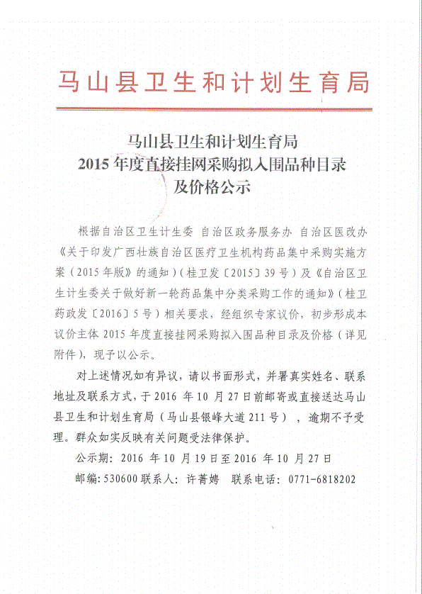 广西壮族自治区南宁市马山县卫生和计划生育局2015年直接挂网采购拟入围目录及价格公示