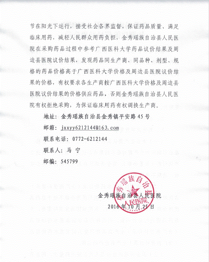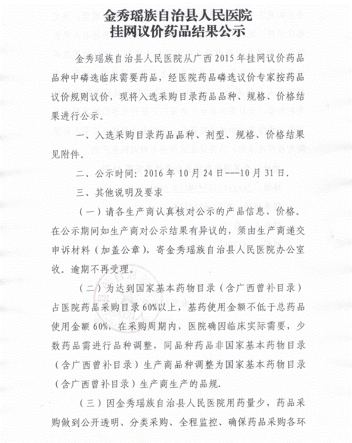 2016年广西壮族自治区来宾市金秀瑶族自治县人民医院挂网议价药品结果公示