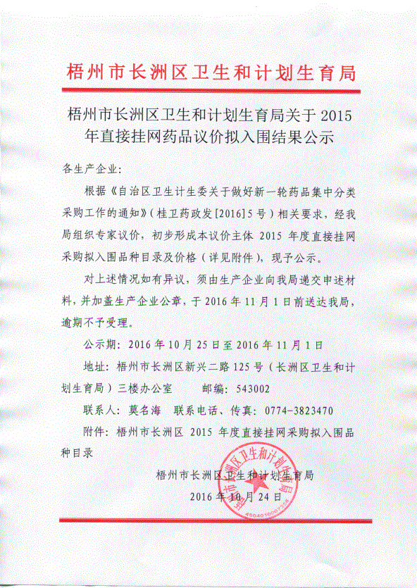 > 广西壮族自治区关于梧州市长洲区卫生和计划生育局关于2015年直接挂网药品议价拟入围结果公示