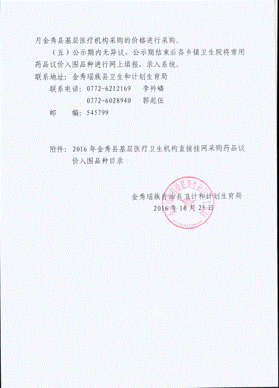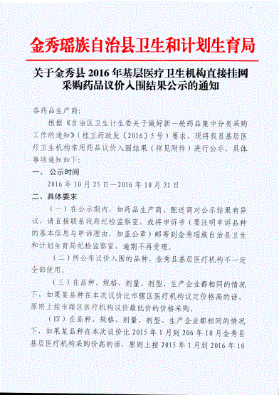 广西壮族自治区来宾市关于金秀县2016年基层医疗机构直接挂网采购药品议价入围结果公示的通知
