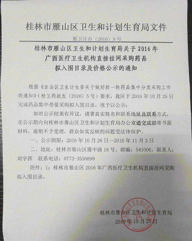 广西壮族自治区桂林市雁山区卫计局关于2016年广西医疗卫生机构直接挂网采购采购药品拟入围目录及价格公示的通知