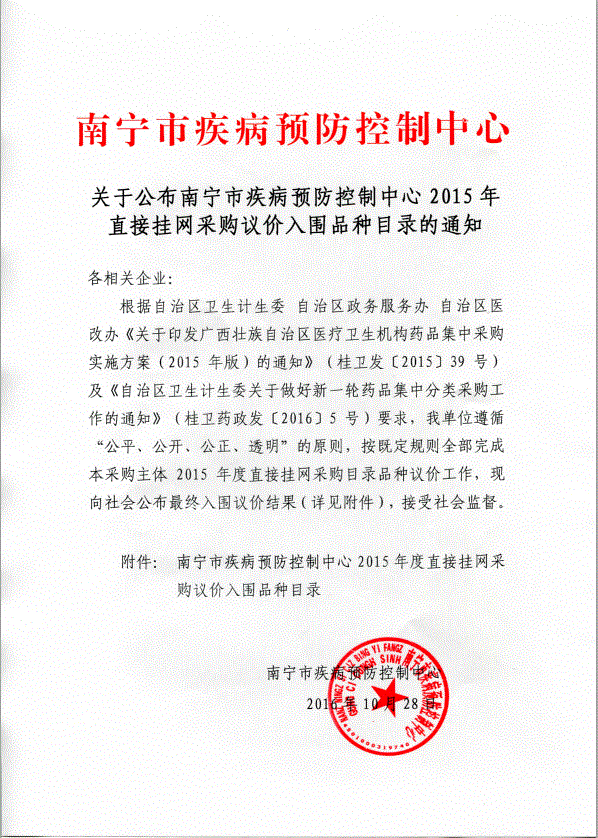 广西壮族自治区关于公布南宁市疾病预防控制中心2015年直接挂网采购议价入围品种目录的通知