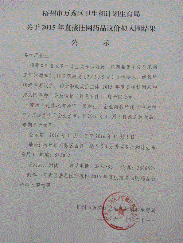 广西壮族自治区梧州市万秀区卫生和计划生育局关于2015年直接挂网药品议价拟入围结果公示