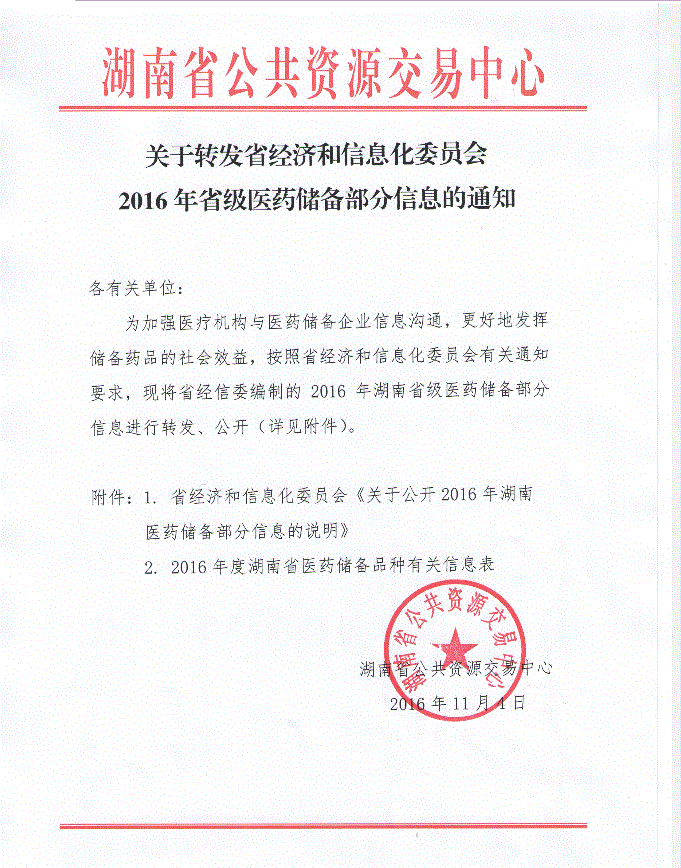 湖南省关于转发省经济和信息化委员会2016年省级医药储备部分信息的通知