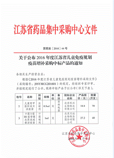 > 关于公布2016年度江苏省儿童免疫规划疫苗增补采购中标产品的通知(苏药采(2016)44号)