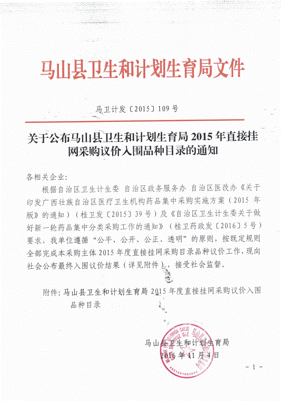 广西壮族自治区南宁市关于公布马山县卫生和计划生育局2015年直接挂网采购议价入围品种目录的通知