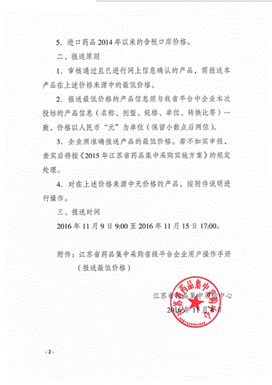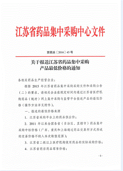 > 2016年江苏省关于报送药品集中采购产品最低价格的通知