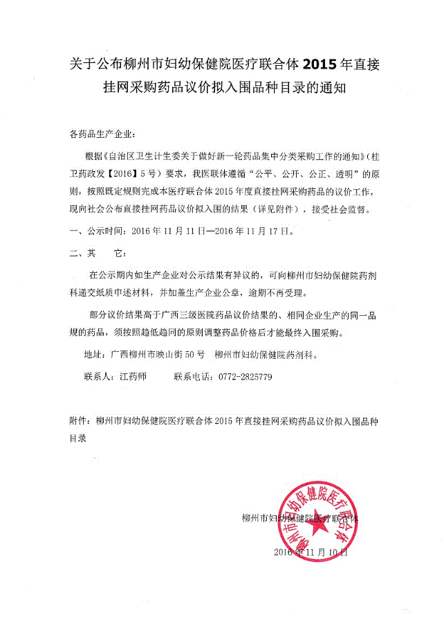 广西壮族自治区关于公布柳州市妇幼保健院医疗联合体2015年直接挂网采购药品议价拟入围品种目录的通知