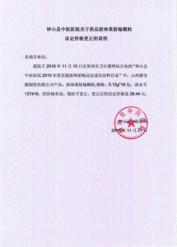 2016年广西壮族自治区贺州市钟山县中医医院关于药品胶体果胶铋颗粒议定价格更正的说明