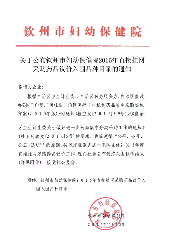 广西壮族自治区关于公布钦州市妇幼保健院2015年直接挂网采购药品议价入围品种目录的通知