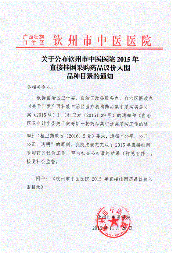 > 广西壮族自治区关于公布钦州市中医医院2015年直接挂网采购药品议价入围品种目录的通知