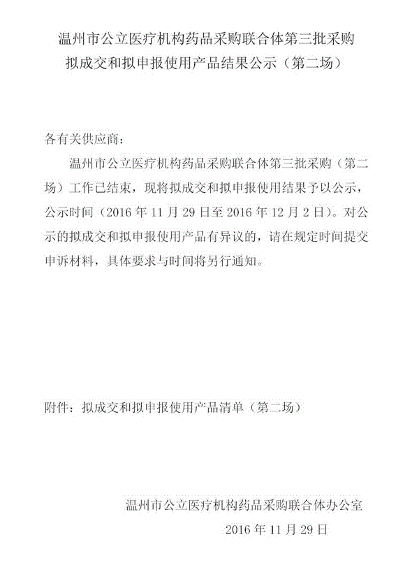 2016年浙江省温州市公立医疗机构药品采购联合体第三批采购拟成交和拟申报产品结果公示(第二场)