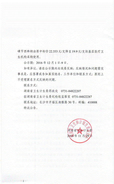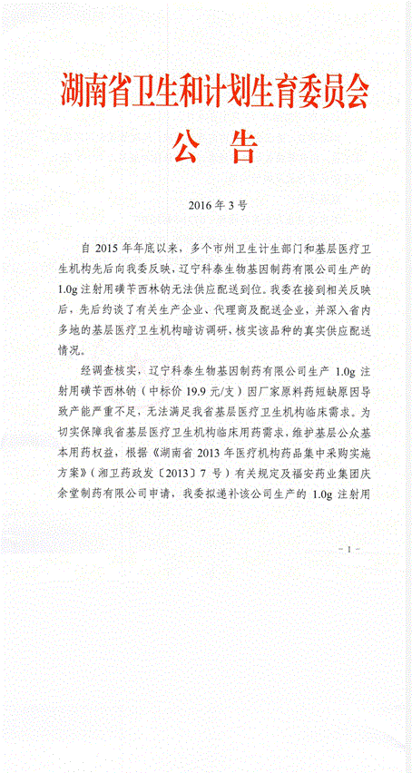 > 2016年湖南卫计委关于调整注射用磺苄西林钠中标信息的公示通知