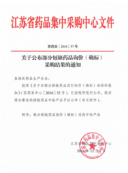 > 2016年江苏省关于公布部分短缺药品询价(确标)采购结果的通知(苏药采(2016)57号)