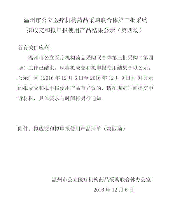 2016年浙江省温州市公立医疗机构药品采购联合体第三批采购拟成交和拟申报产品结果公示(第四场)