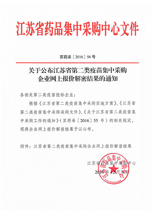 > 2016年江苏省关于公布第二类疫苗集中采购企业网上报价解密结果的通知