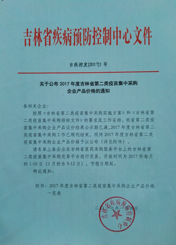 关于公布2017年度吉林省第二类疫苗集中采购企业产品价格的通知