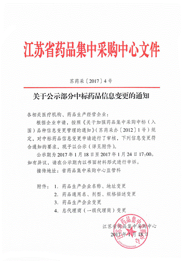 > 2017年江苏省关于公示部分中标药品信息变更的通知(苏药采(2017)4号)