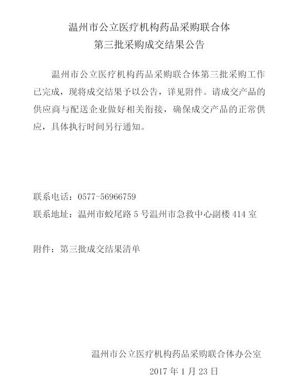 2017年浙江省温州市公立医疗机构药品采购联合体第三批采购的成交结果公告