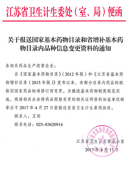 2017年江苏省卫计委转载关于报送国家基本药物目录和省增补基本药物目录内品种信息变更资料的通知