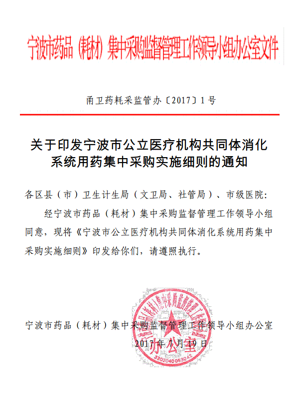 > 2017年浙江省宁波市关于印发宁波市公立医疗机构共同体消化系统用药集中采购实施细则的通知