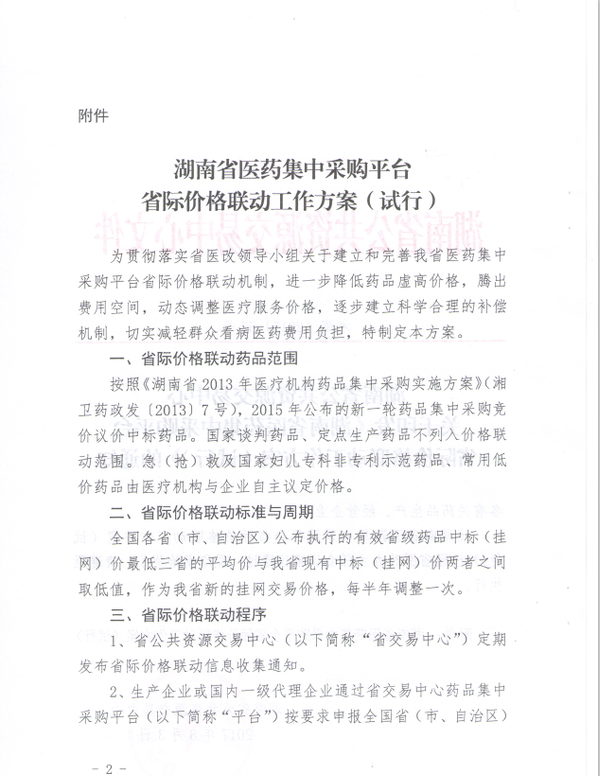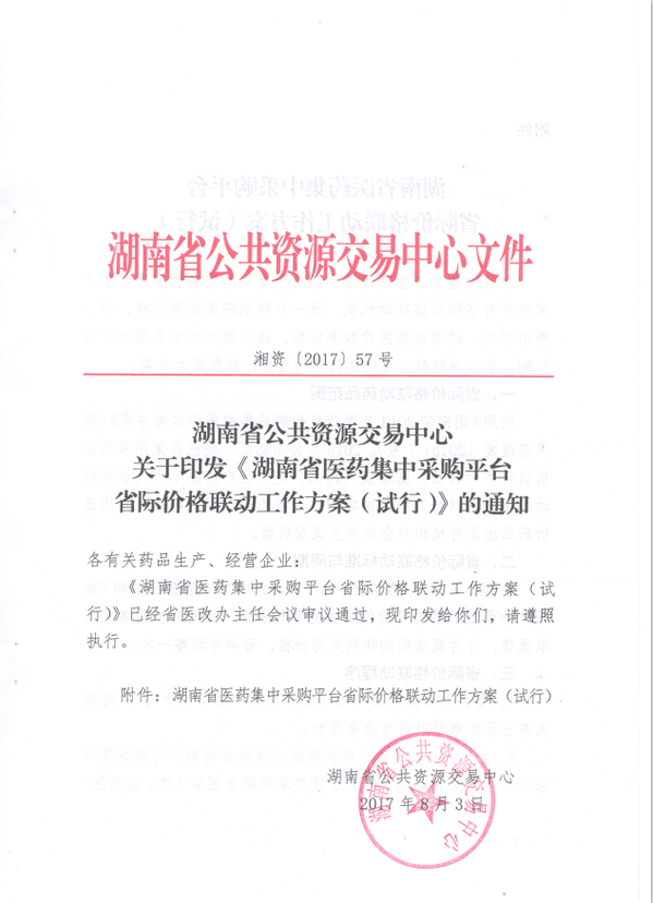 > 2017年湖南省公共资源交易中心关于印发《湖南省医药集中采购平台省际价格联动工作方案(试行)》的通知