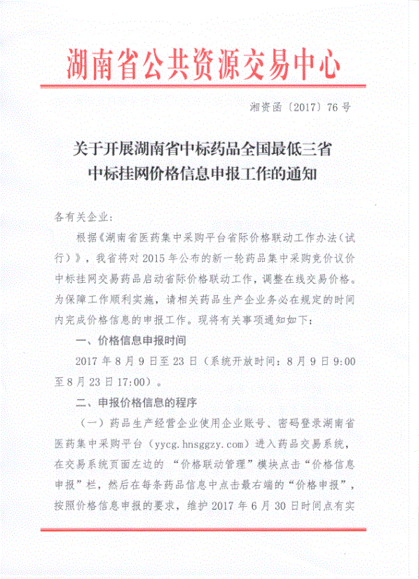 2017年湖南省关于开展湖南省中标药品全国最低三省中标挂网价格信息申报工作的通知