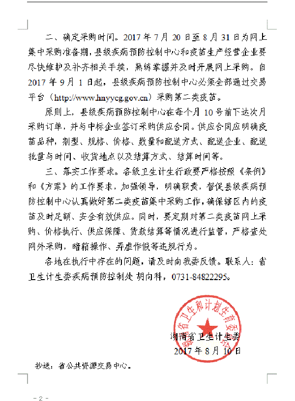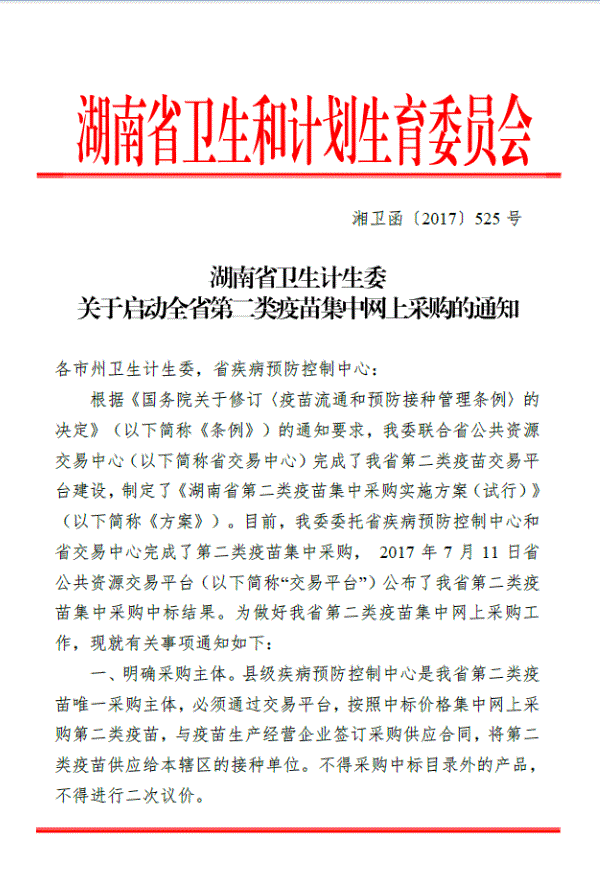 > 2017年湖南省卫生计生委关于启动全省第二类疫苗集中网上采购的通知