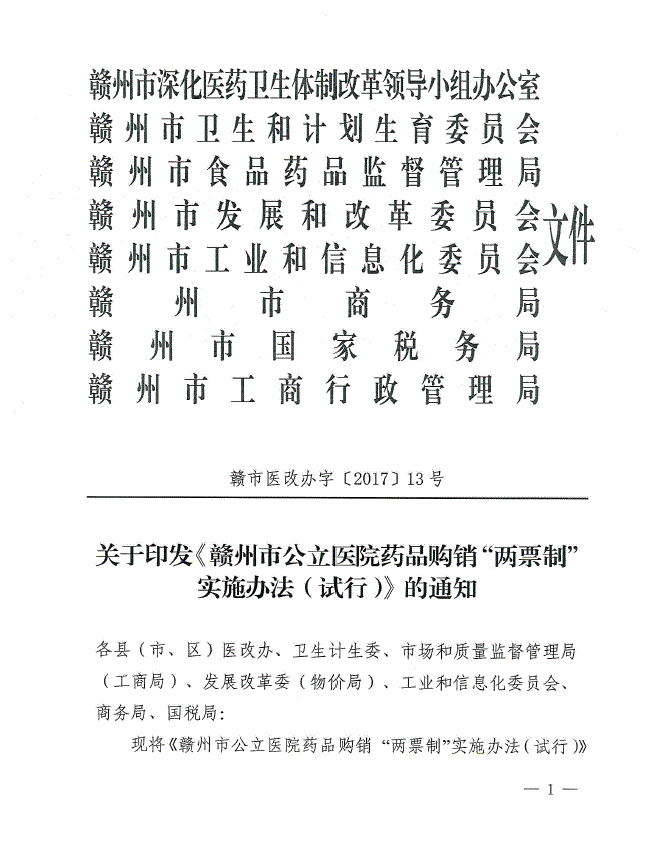 > 2017年江西省关于印发赣州市公立医院药品购销“两票制”实施办法(试行)的通知