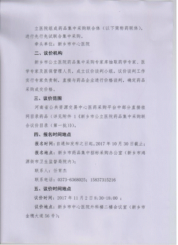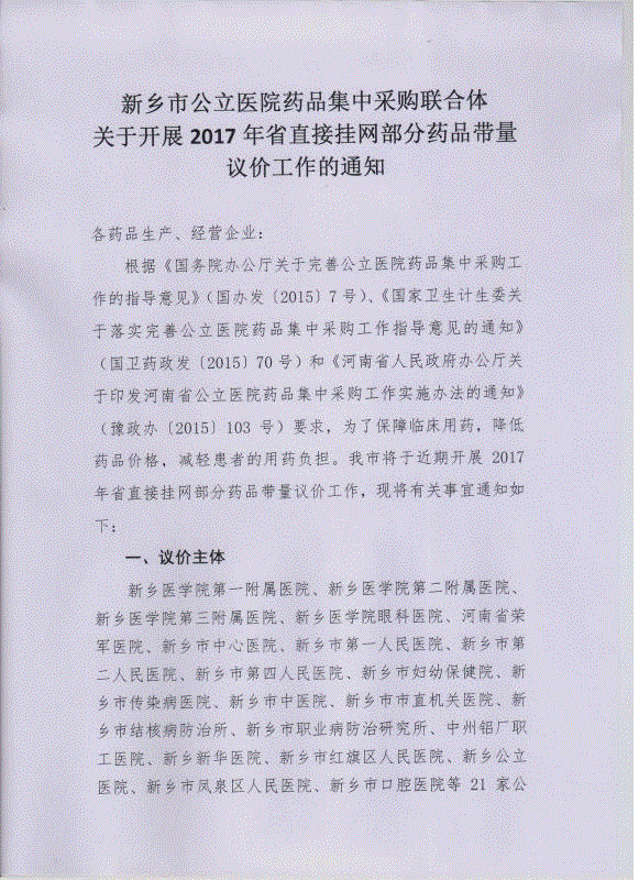 > 河南省新乡市公立医院药品集中采购联合体关于开展2017年省直接挂网部分药品带量议价工作