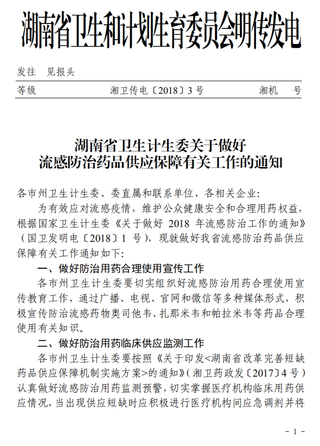 > 2018年湖南省卫生计生委关于做好流感防治药品供应保障有关工作的通知