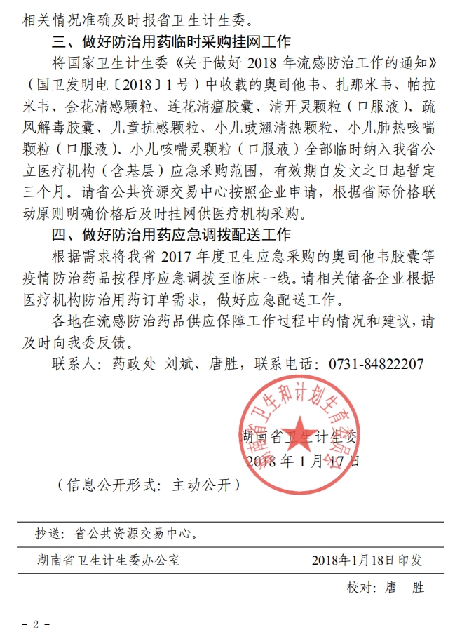 2018年湖南省卫生计生委关于做好流感防治药品供应保障有关工作的通知