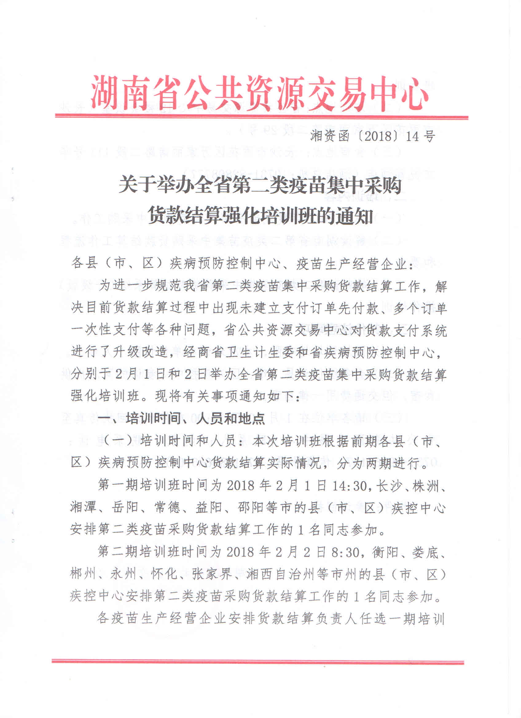 2018年湖南省关于举办全省第二类疫苗集中采购货款结算强化培训班的通知