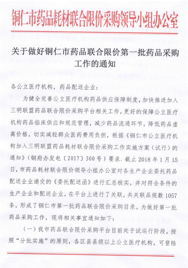 > 2018年贵州省关于做好铜仁市药品联合限价第一批药品采购工作的通知